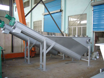砂水混合物從頂部的法蘭接管進(jìn)入儲(chǔ)液箱內(nèi)。箱內(nèi)專門設(shè)計(jì)的散水盤使水匯集于下水槽。砂水混合夜中,砂石逐漸沉淀于下部的螺旋u形槽內(nèi)。空心帶式螺旋緩慢旋轉(zhuǎn)砂礫推向上出口,自然脫水排除。